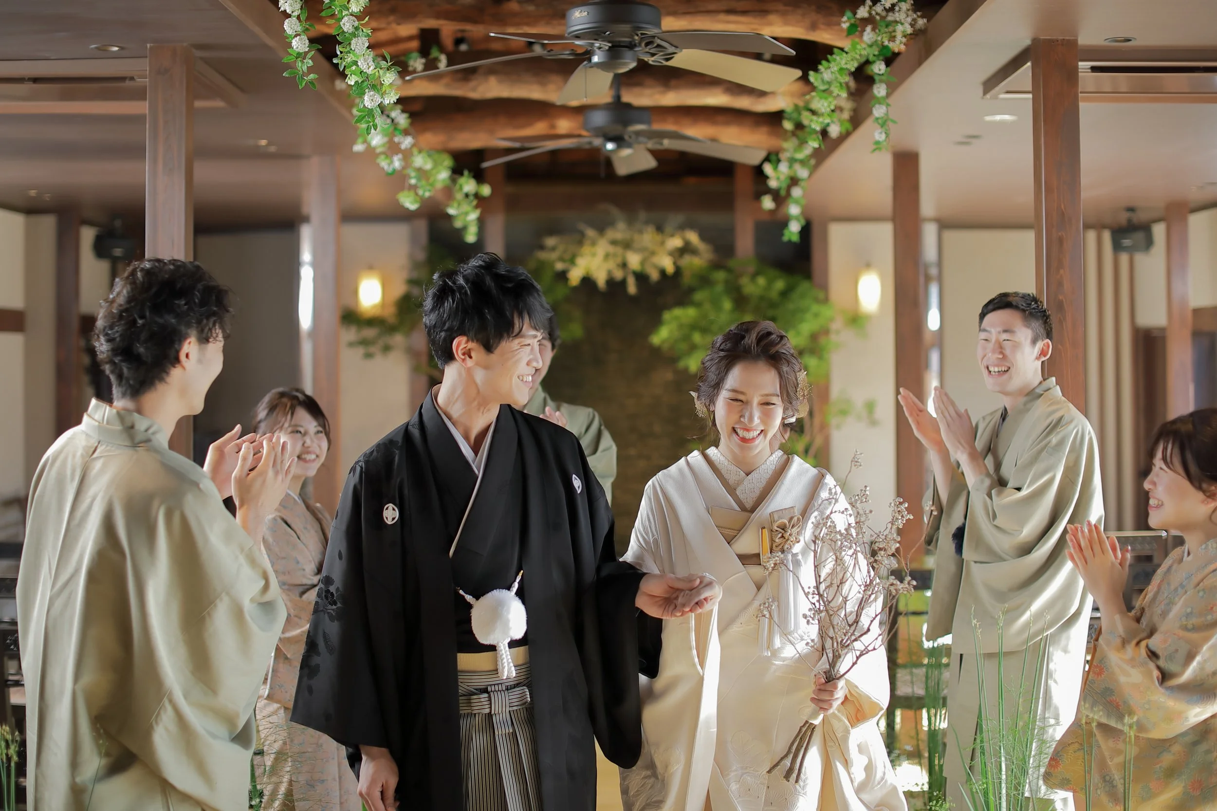 衣装と挙式スタイルでもご説明したように、和装は、神前式などの和婚だけでなく、人前式でも着ることが可能です。例えば、チャペルで愛らしい花柄の色打掛を纏っての挙式など、おふたりらしい装いで結婚式を挙げることができます。
