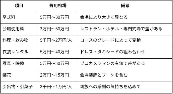 親族のみの結婚式にかかる費用は、いくつかの主要な項目に分けることができます。それぞれの項目について詳しく見ていきましょう。