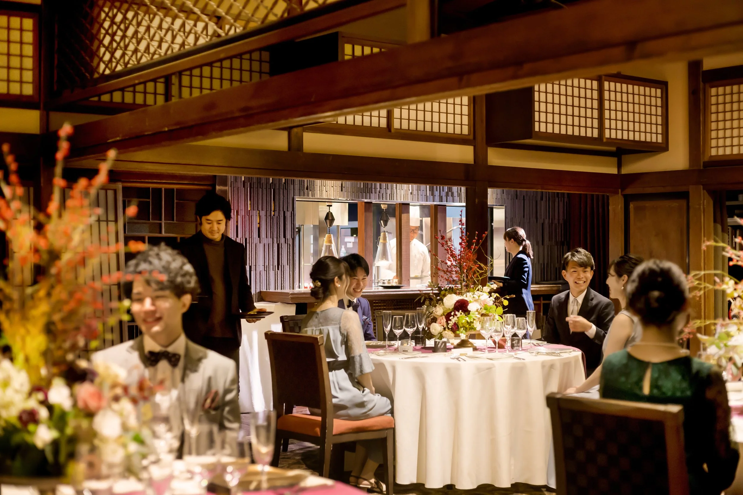 フルコース料理の場合、一般的に7品から10品程度が提供され、すべてを召し上がるには約1時間30分程度の時間が必要です。演出を行うタイミングは、お料理のサーブの合間を狙うとよいでしょう。また、年配のゲストや小さなお子様がいらっしゃる場合は、特に時間への配慮が求められます。