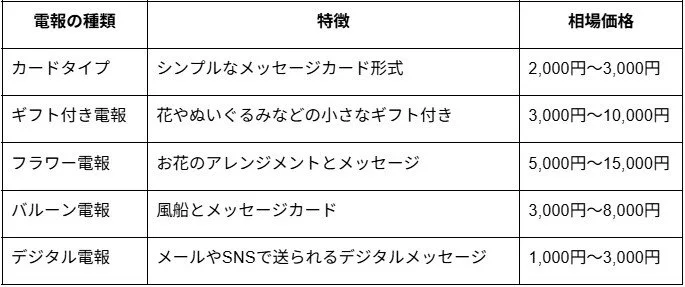 現代の「電報」は、従来の文字だけのメッセージカードから進化し、様々な形で提供されています。主なタイプには以下のようなものがあります
