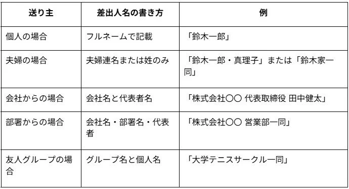 差出人名の書き方も、電報を送る際の重要なマナーです。状況によって適切な書き方が異なりますので、以下を参考にしてください。